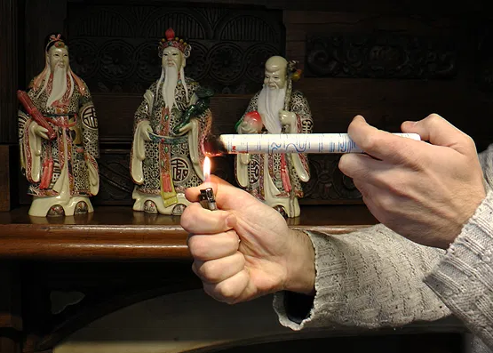 - Light up the moxa stick and gently blow on it to ensure that all the tip is burning – no flame should be seen (always blow away from your body and other people’s body as well as easily inflammable objects)